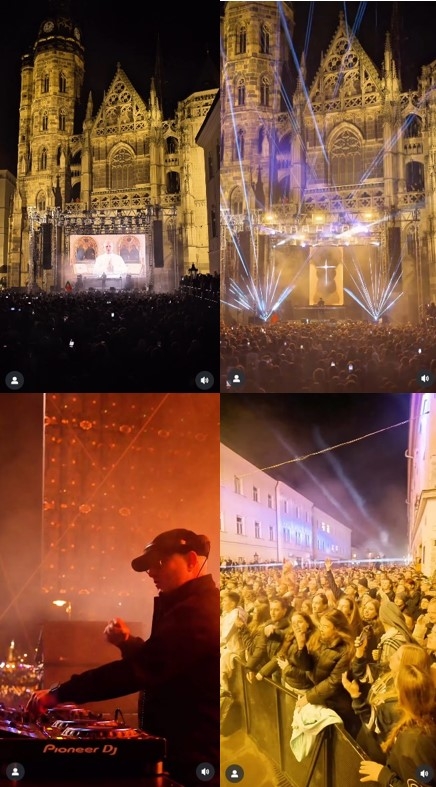 Bernard Bober, Archbishop of Košice, Slovakia celebrates 75th birthday with video message from Pope Leo followed by electronic music rave party and light show by priest DJ Padre Guilherme in front of the Cathedral of St. Elizabeth in Košice.