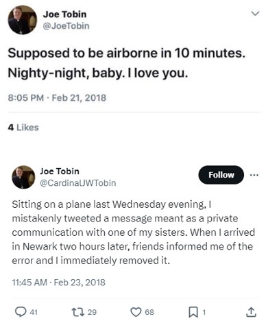 Joseph Cardinal Tobin inadvertently tweets, "Supposed to be airborne in 10 minutes. Nighty-night, baby. I love you." Two days later he publishes an explanation that it was meant to be a private message to his sister.